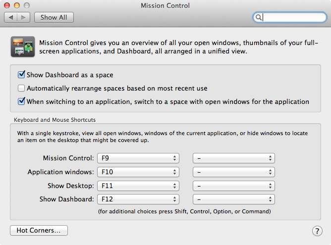 - A partir do Lion existe a funcionalidade Mission Control que você ativa colocando quatro dedos no touchpad e arrastando pra cima. Ele é um “substituto” do antigo Exposé e é realmente prático quando se acostuma. Aplicativos, quando “maximizados”, se tornam seu próprio “Space” paralelo e você pode navegar entre eles arrastando 3 dedos no touchpad, pra direita ou pra esquerda. Porém, a configuração padrão é que esses Spaces se rearrangem dinamicamente baseado no uso. Eu particularmente acho isso ruim porque eu gosto de ter meus aplicativos e desktops sempre na mesma posição (no Mission Control você pode arrastar os Spaces de lugar para deixar onde gosta mais). Para desabilitar esse rearranjo forçado, vá em “System Preferences, opção Mission Control” e desabilite a opção “Automatically rearrange spaces based on most recent use”.