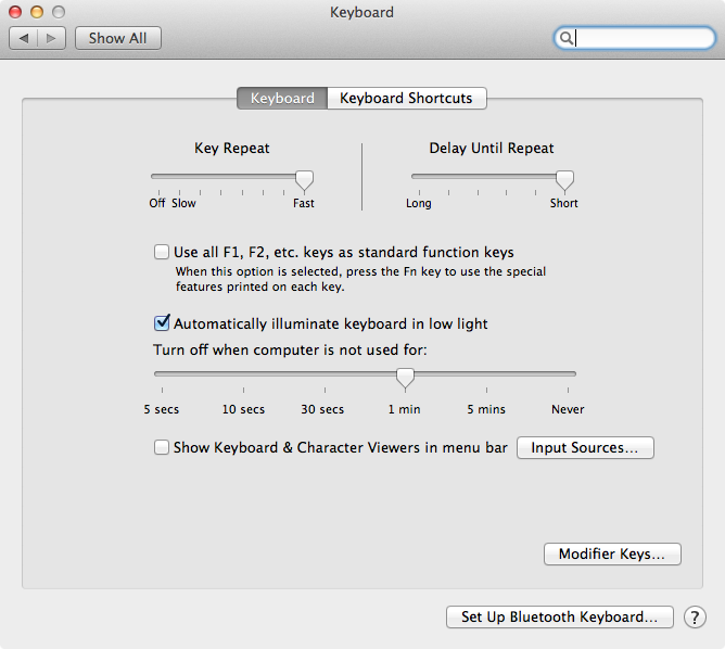 - Se não me engano, da mesma forma como é no Windows e outros OS, no Mac a velocidade de digitação do teclado é configurada por padrão pra ser meio lenta. Por exemplo, experimente abrir um editor de texto qualquer e usar as setas para posicionar o cursor, vai notar que é demorado. Eu prefiro que a velocidade seja máxima. Para isso vá em “System Preferences, opção Keyboard” e deixe a opção “Key Repeat” para “Fast” e “Delay Until Repeat” em “Short”. Você vai me agradecer: